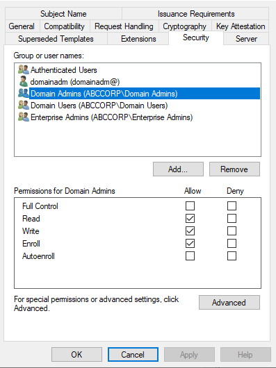 Permissions for Domain Admins | Allow | Deny |