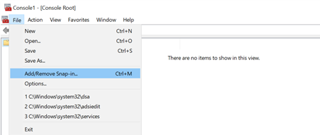 The Microsoft Management Console appears. - Select File > Add/Remove Snap-in. The Add or Remove Snap-ins dialog box appears.