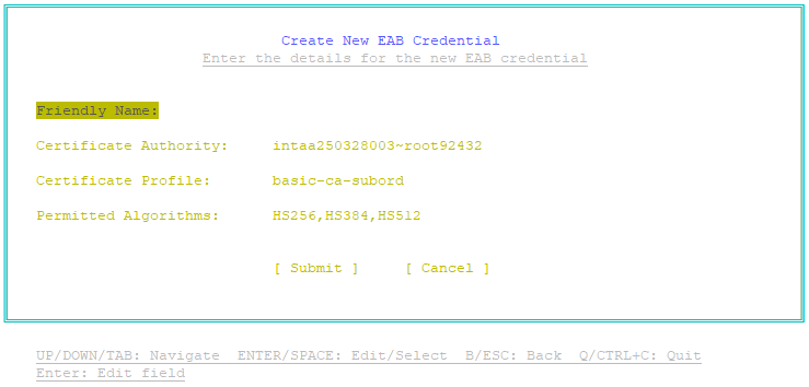 The Create New EAB Credential page appears. - Each External Account Binding credential in the EAB Utility is identified by a unique string called a friendly name. Provide a friendly name for the credential: