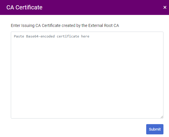 12. If the root CA of the new intermediate CA is an external root CA, click Upload certificate and paste a PEM-encoded certificate issued by the root CA