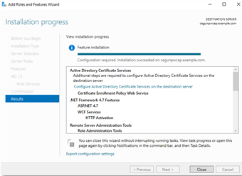 The Installation Progress page appears. A progress indicator displays the progress of the installation. After the roles and features are installed, a success message appears. - Click Close.
