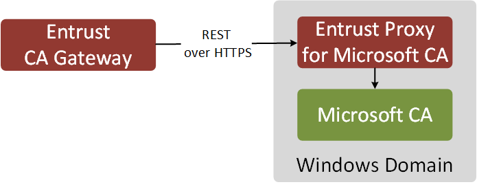 In this architecture, CA Gateway is a client of Microsoft CA. See in the following sections how to configure the Entrust Proxy for Microsoft CA and CA Gateway to manage Microsoft CAs.