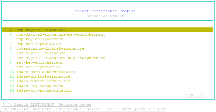 2. Select the certificate profile that will issue the certificate to the ACMEv2 clients, and then press Enter. For Entrust PKI as a Service, the profile ID is one of the following: