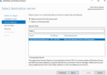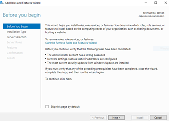 The Add Roles and Features Wizard dialog box appears. - If the Before you Begin page appears, click Next.