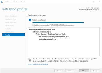 A progress indicator displays the progress of the installation. After the roles and features are installed, a success message appears. - Click Close.