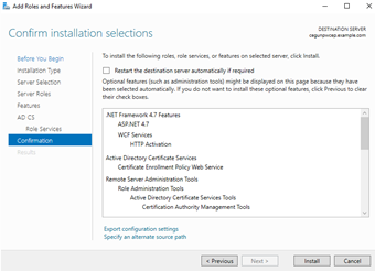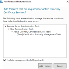 Another Add Roles and Features Wizard dialog box may appear, informing you that some features are required for Active Directory Certificate Services. - Click Add Features to add these required features and close the dialog box.