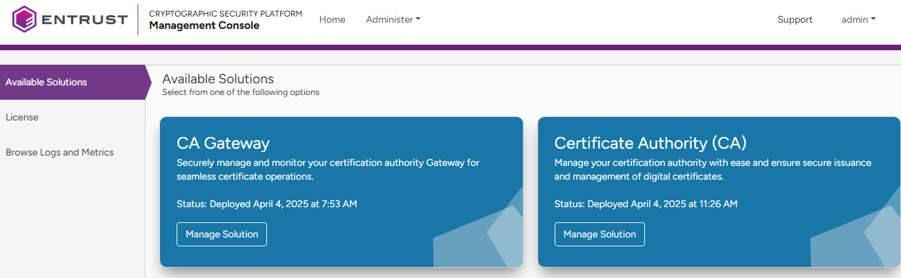 <machine>is the IP address or domain name of the machine hosting Cryptographic Security Platform.- Log in to the Management Console as a user belonging to a role with CA Gateway management permissions – for example, the initial