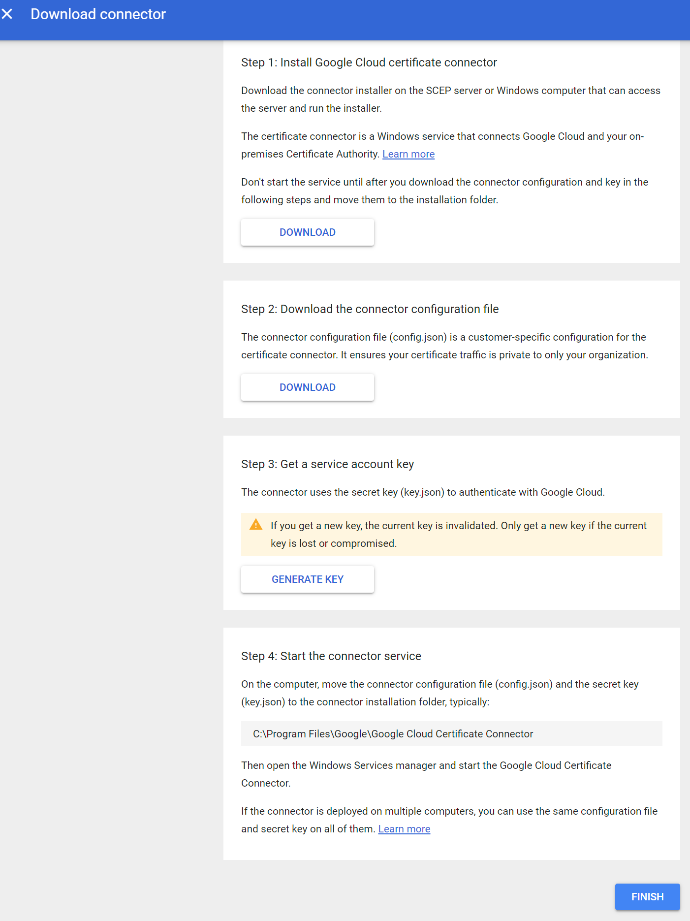 The Google Cloud Certificate Connector is a Windows service that securely distributes certificates and authentication keys from a SCEP server to users’ devices. The Google Cloud Certificate Connector must be installed on Domain-joined Windows server.