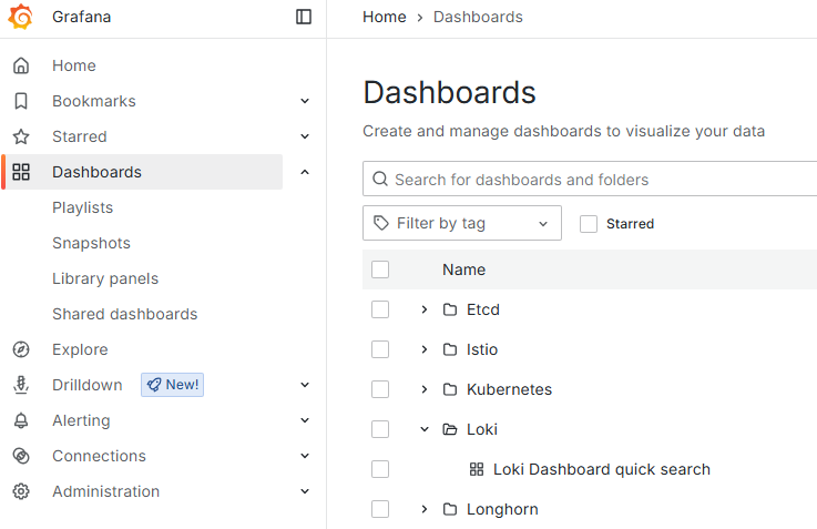- Select Loki > Loki Dashboard quick search in the content pane.