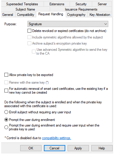 If the Microsoft CA settings configure Request Handling as follows.