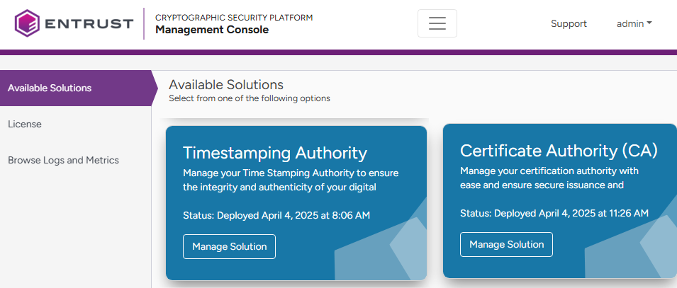 - In the content pane, click Manage Solution under Timestamping Authority.