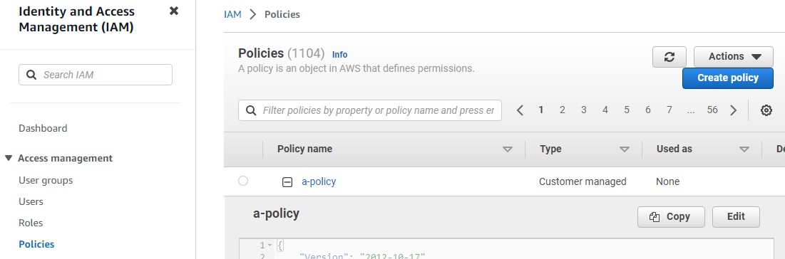 - In the content pane, click the name of an existing IAM policy or click Create policy to create a new one.