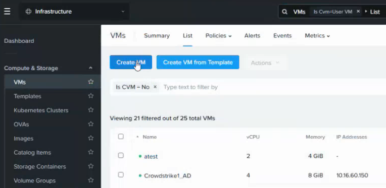 - Select Compute & Storage > VMs in the navigation sidebar and click Create VM in the content pane.