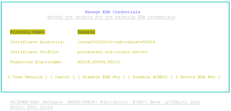 If you want to temporarily prevent an External Account Binding credential from being used by ACMEv2 clients, disable ACMEv2 operations for the credential instead (see Disabling ACMEv2 operations for External Account Binding credentials).