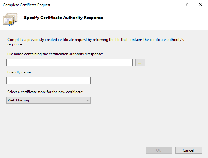 7. From the Select a certificate store for the new certificate drop-down list, select Web Hosting.