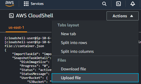 Alternatively, you can use the ShellCloud provided by the AWS console. This option requires uploading the configuration file as explained below.