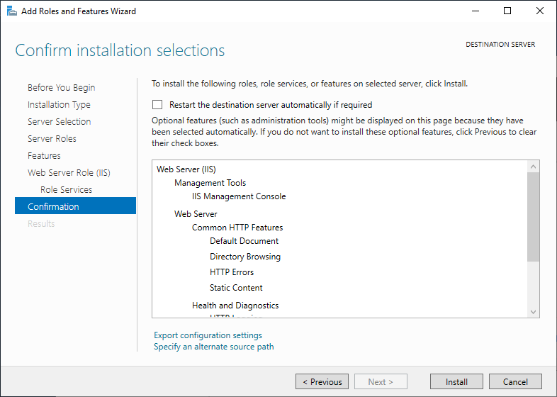 18. The Installation Progress page appears. A progress indicator displays the progress of the installation. After IIS is installed, the Installation results page appears.