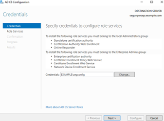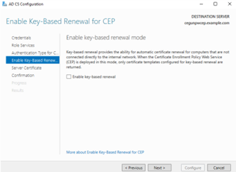 The Certificate Enrollment Policy Web Service requires a TLS certificate in Microsoft IIS. You will set the TLS certificate later, as explained in Configuring the TLS certificate of the Windows endpoints.