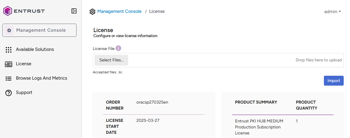 The Cryptographic Security Platform license determines the Entrust solutions you are allowed to run on Cryptographic Security Platform. See below for how to set or update this license using the Management Console.
