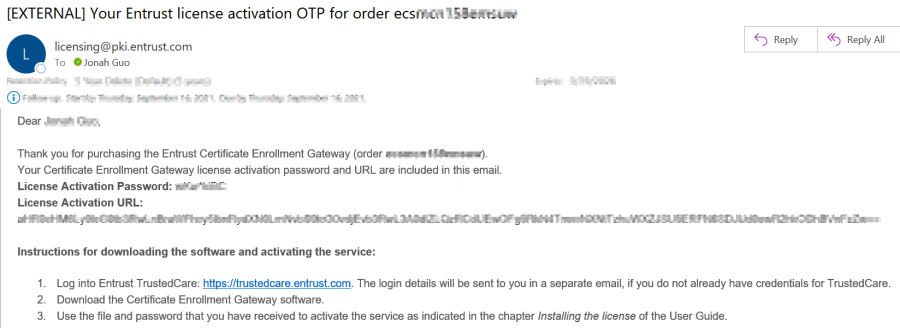 - If you no longer have the original activation email or try to activate the software after 14 days, please contact Entrust Support to resend the activation email.