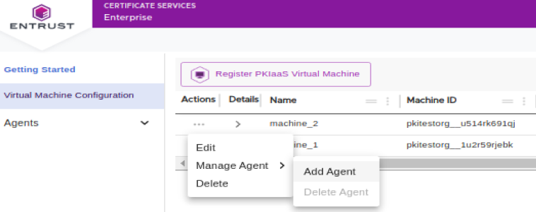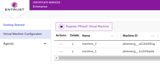 - In the PKIaaS Virtual Machines grid, click the ... three dots icon of the machine you registered in Registering a PKIaaS Virtual Machine.