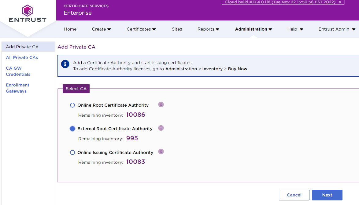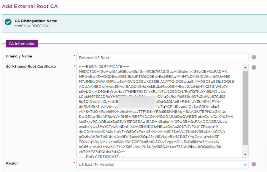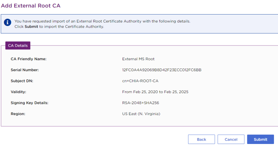 For this use case, you must add your external root CA certificate in ECS Enterprise before adding an issuing CA (as explained in Adding an issuing CA under an external root CA).