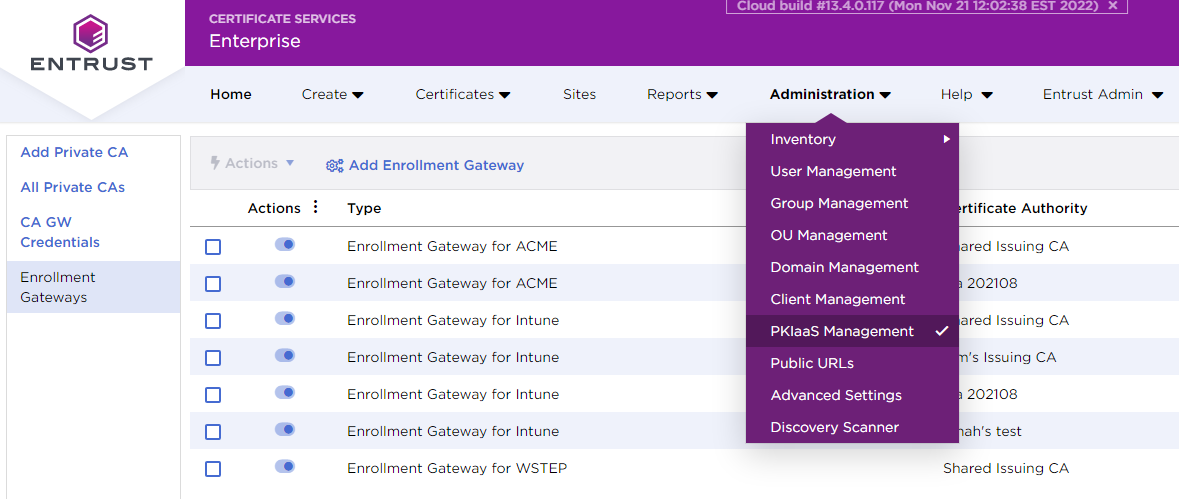 - Select Administration > PKIaaS Management.