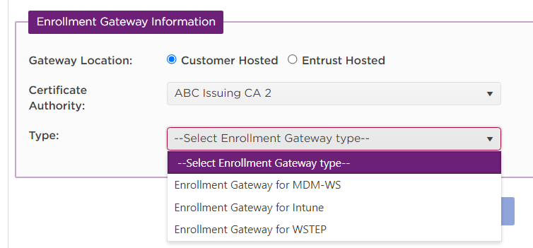 In Type, select one of the Certificate Enrollment Gateway services enabled in the issuing CA.