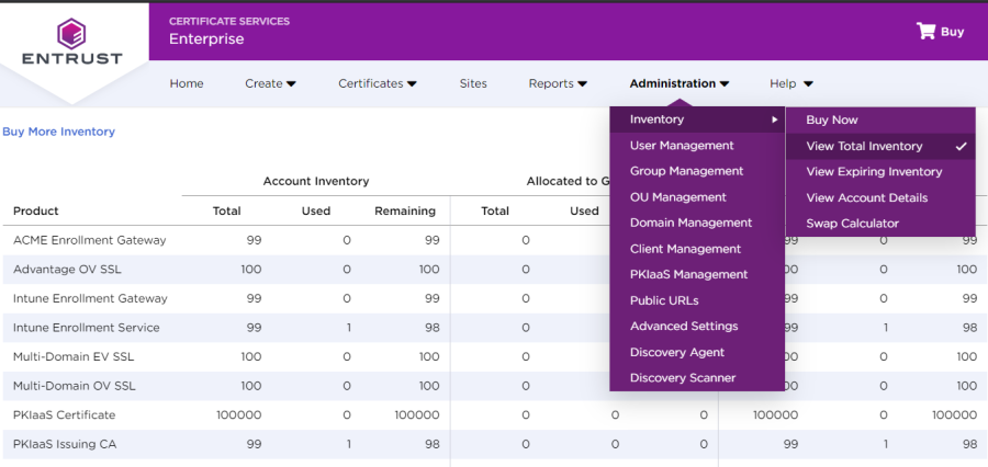 To check your PKIaaS inventory in Entrust Certificate Services (ECS), navigate to Administration > Inventory > View Total Inventory.