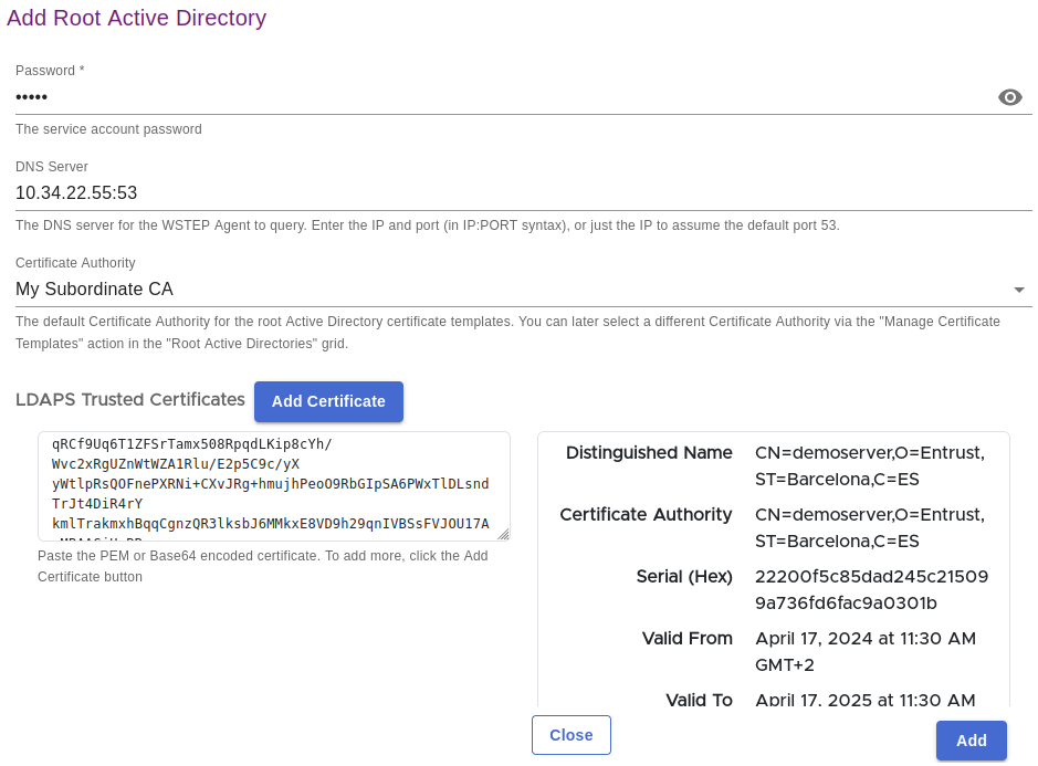 The root CA certificate of the LDAPS TLS certificates chain. The PKIaaS Virtual Machine will use this root CA certificate for validating connections with the Active Directory LDAPS service. Click Add Certificate to import one or more root CA certificates.
