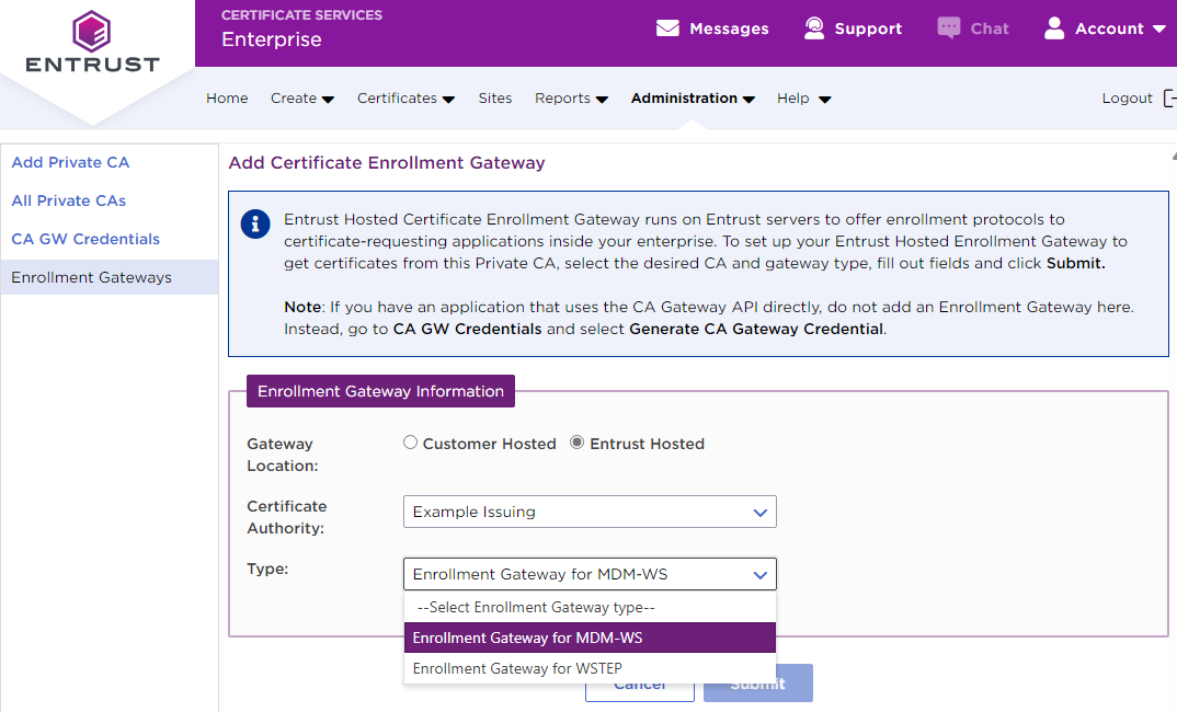 On the Entrust Certificate Services portal, add and configure a Certificate Enrollment Gateway instance to process MDM requests.