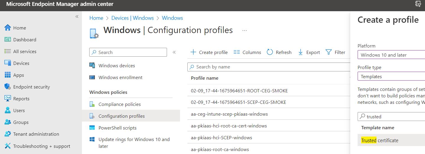 Template name | Trusted certificate | Trusted certificate | SCEP certificate |