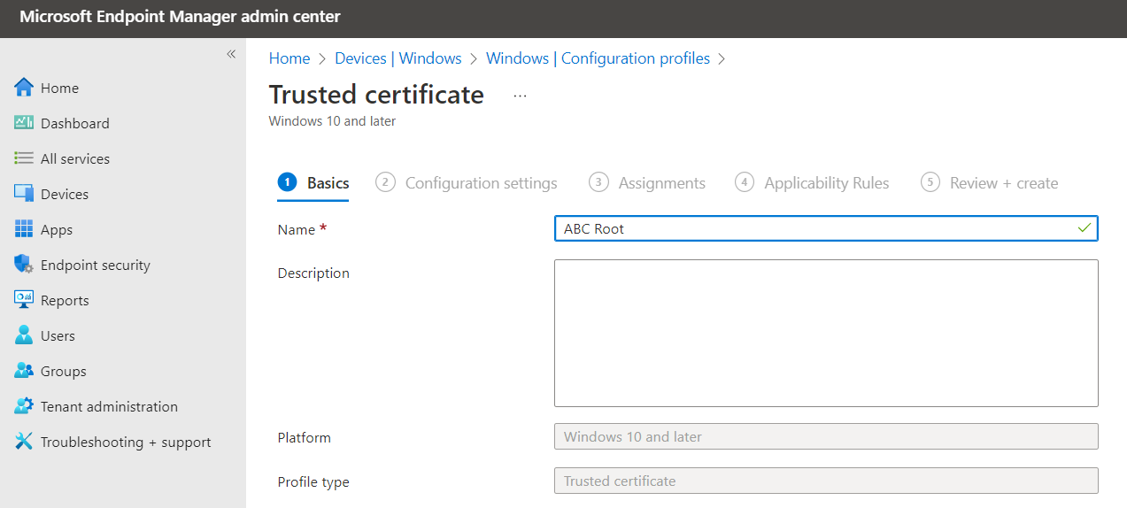 Create the following profiles for enrolling Microsoft Windows devices with Intune.
