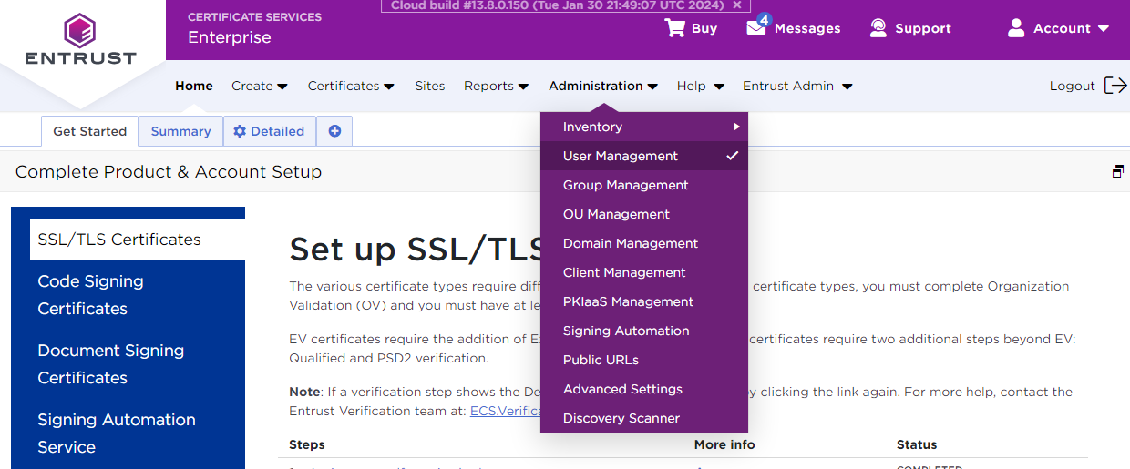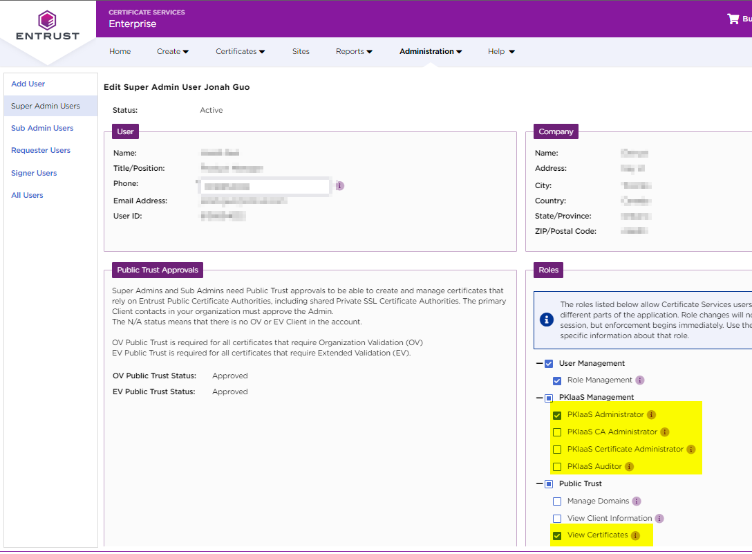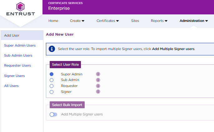 - Log into Entrust Certificate Services as a Super Admin with the User Management role.