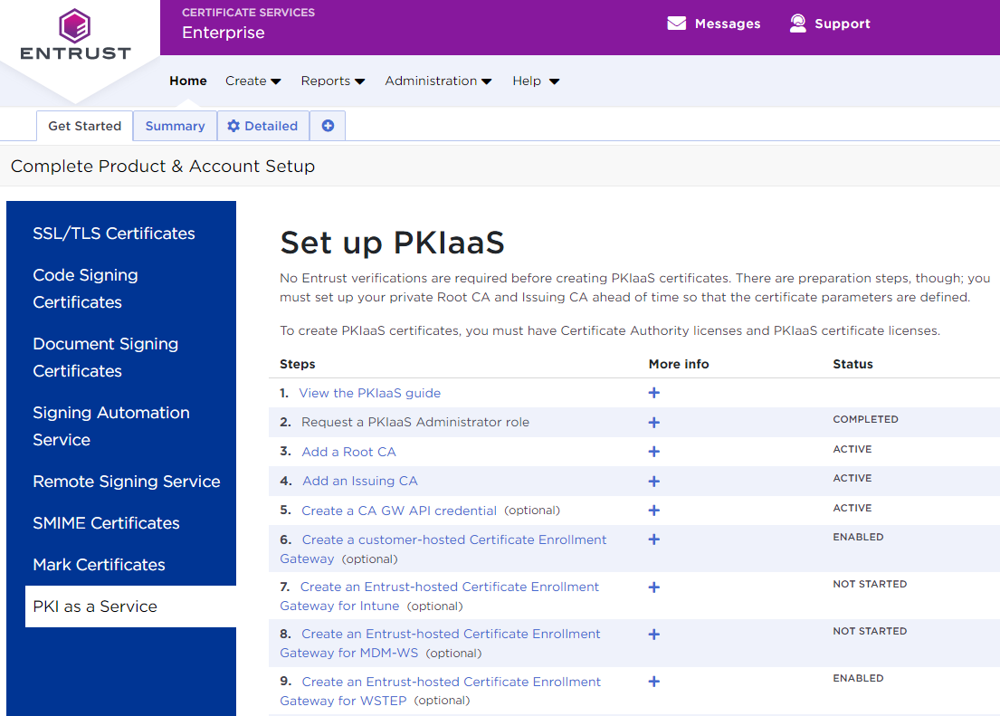 In the Set up PKIaaS pane, click Create an Entrust-hosted Certificate Enrollment Gateway for WSTEP.