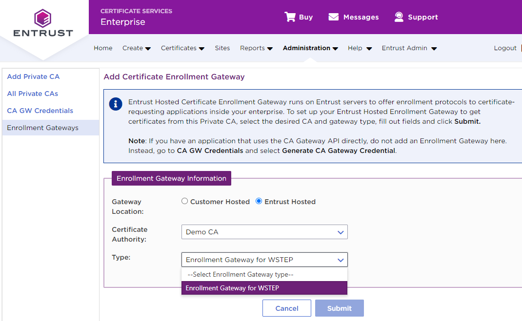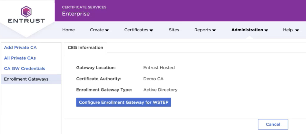 On the Entrust Certificate Services portal, add and configure a Certificate Enrollment Gateway instance to process WSTEP requests.