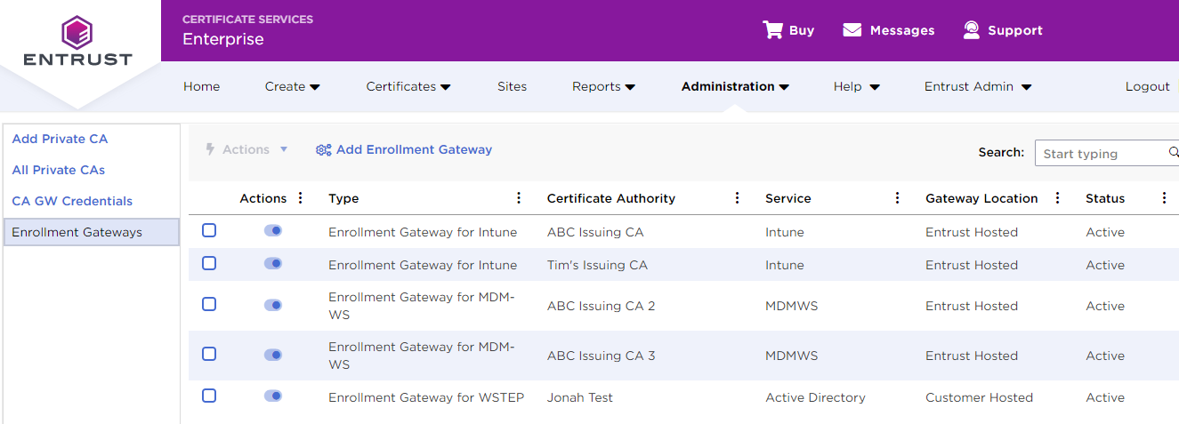 - In the navigation sidebar, click Enrollment Gateways to display the Certificate Enrollment Gateway list.