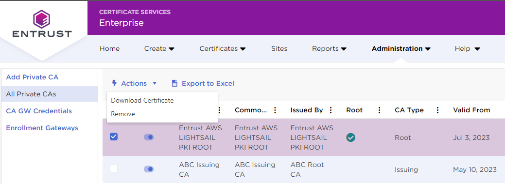 - Check the box at the left of the CA name.