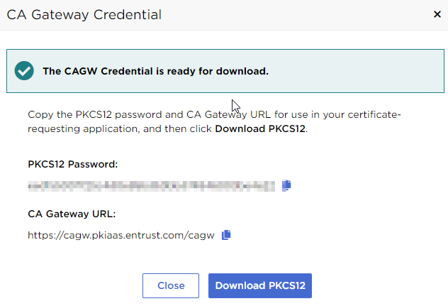 - Copy and store the PKCS12 password and the CA Gateway URL.