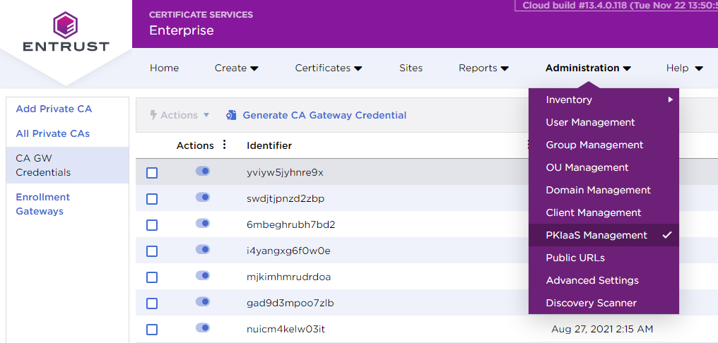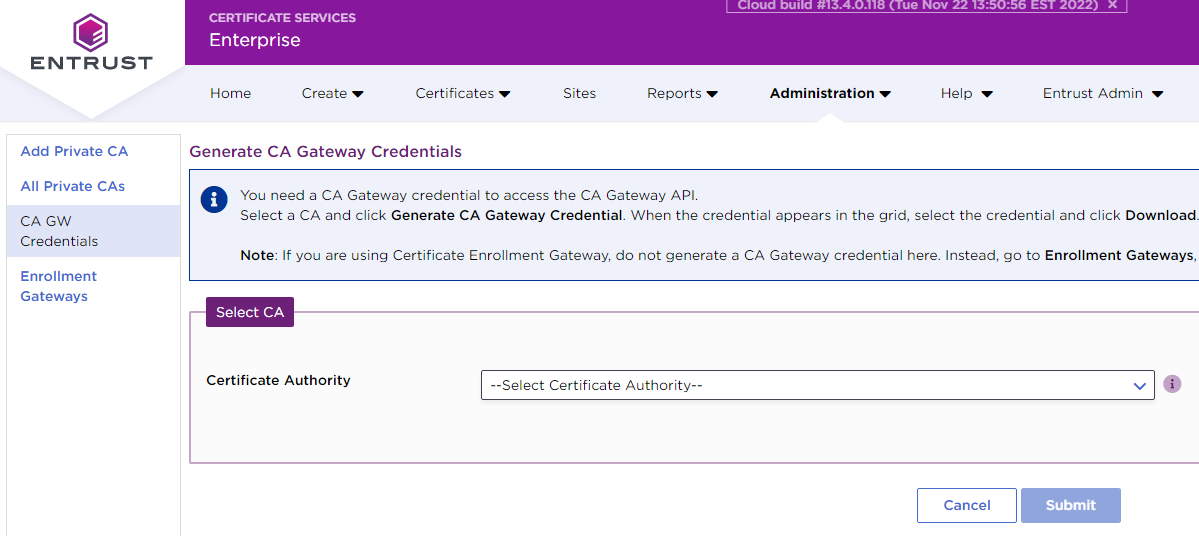 Generate and download credentials to connect with the Entrust CA Gateway API.