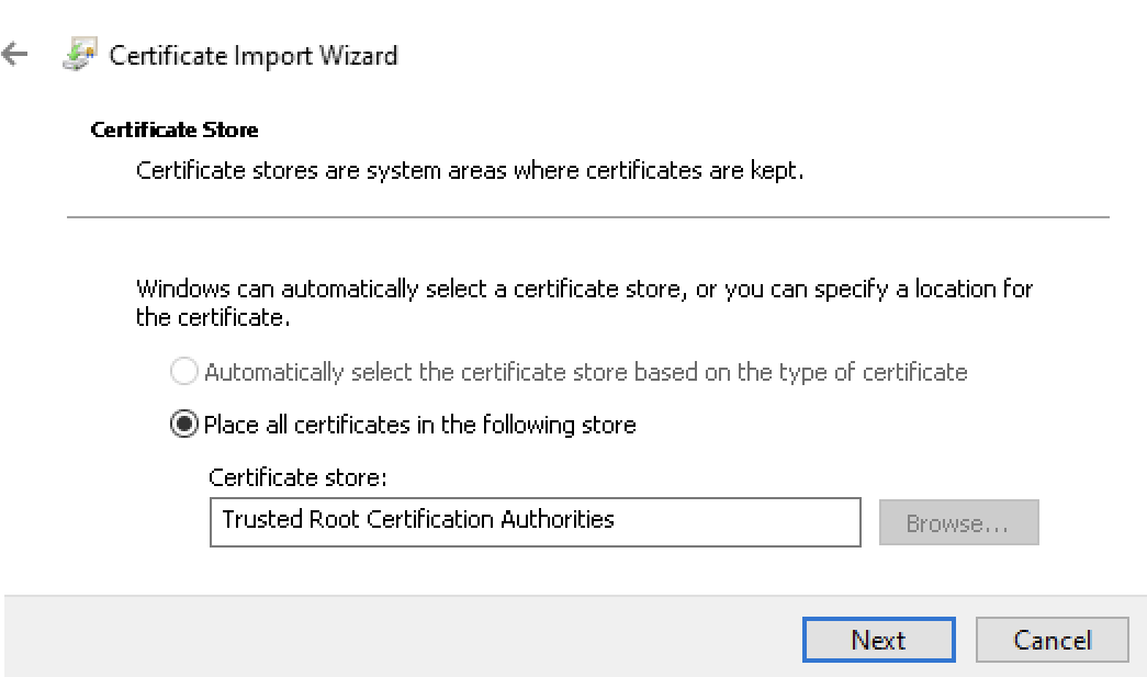 - Verify the selected certificate store is Trusted Root Certification Authorities.