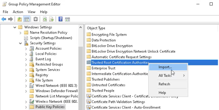 - In the Group Policy Management dialog, navigate to Computer Configuration > Policies > Windows Settings > Security Settings > Public Key Policies.