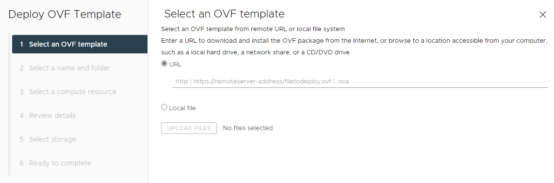 In the Select an OVF template page, click URL to paste the download link, or Local file to import the