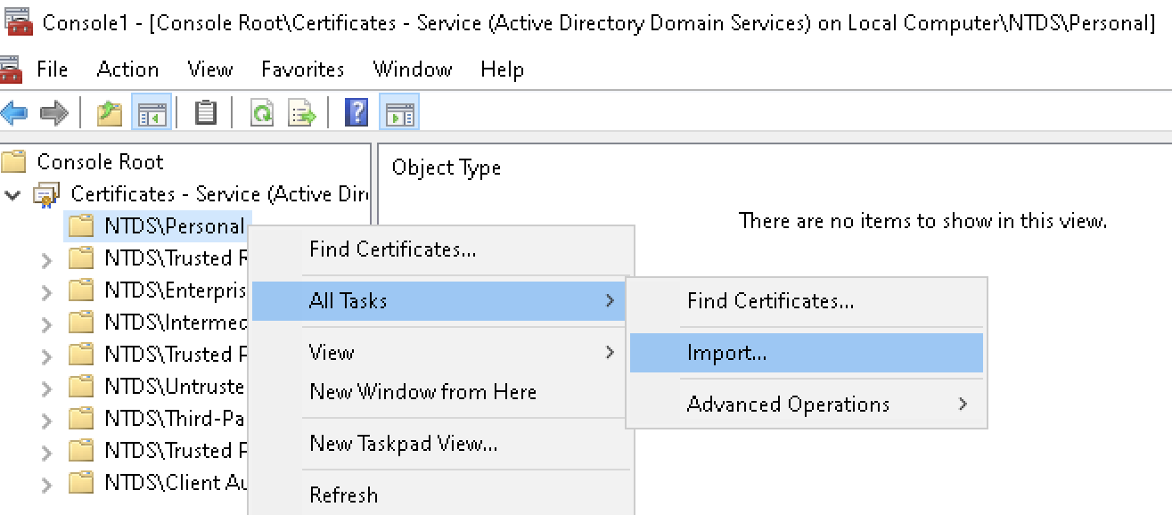 - Follow the wizard instructions to import the certificate file, enter the password, and install the certificate in the NTDS\Personal certificate store.