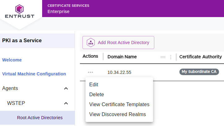 To manage Windows root Active Directory configurations in Entrust PKIaaS, click Agents > WSTEP > Root Active Directories in the sidebar.
