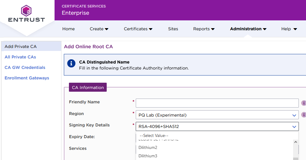 Entrust might rebuild the PQ Lab region from time to time to reflect the latest changes from the post-quantum standards initiatives. On these occasions, your data in this region might be destroyed. We don't recommend deploying post-quantum CAs and certificates to your production environment.