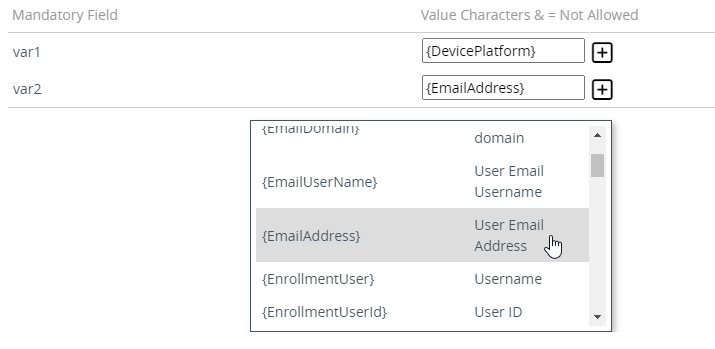 Configure the RDN Format variables as explained in Adding digital identifiers to a Certificate Enrollment Gateway for MDM. You can provide static text or click the symbol and select a Workspace One variable.