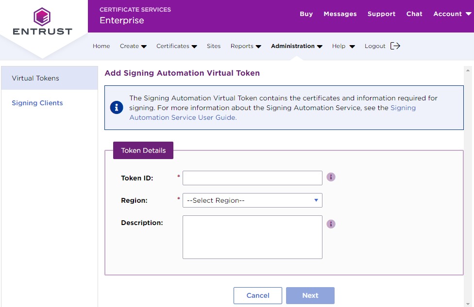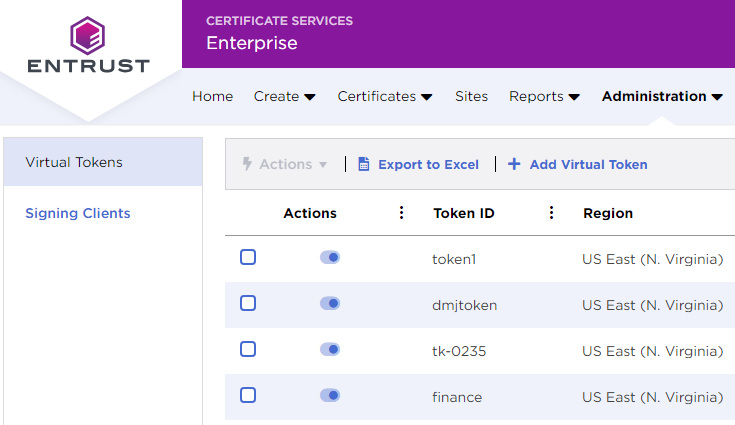 In the Entrust Certificate Services web portal, create at least one Virtual token to manage signing keys and certificates.