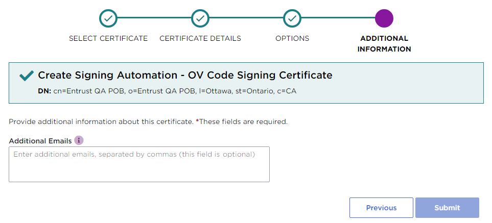 Optionally, enter Additional Emails for receiving notifications on the certificate status.