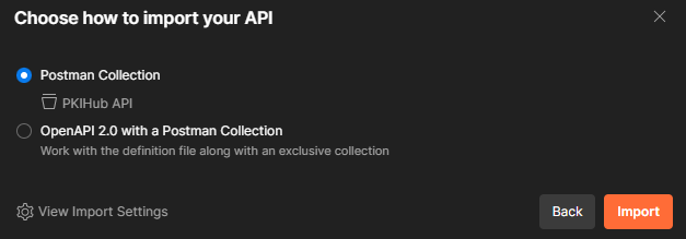 Import the swagger specification of the Raw Signature service as a Postman collection.